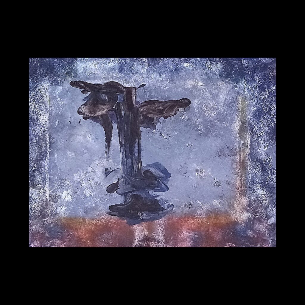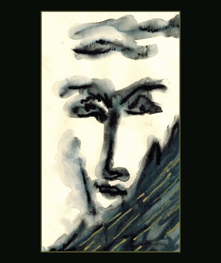 In questo suggestivo acquerello, la nebbia avvolge la scena, creando un’atmosfera misteriosa da cui emerge il volto astratto del Padre, forse Dio stesso. I tratti informali e severi del volto trasmettono autorità e rigore, generando un senso di inquietudine e meraviglia. La visione appare onirica e indefinita, come un sogno che suggerisce l’incertezza del rapporto tra l’uomo e il divino. La nebbia funge da metafora dell’insondabilità del sacro, rivelando solo parzialmente il volto divino e lasciando dietro di sé una scia di riflessioni sull’esperienza del trascendente nella vita umana.