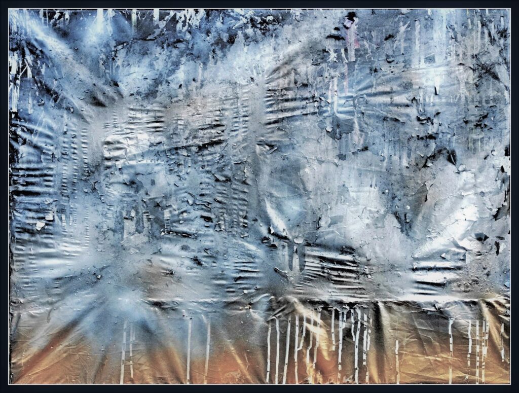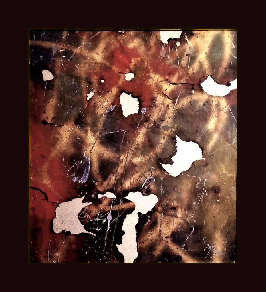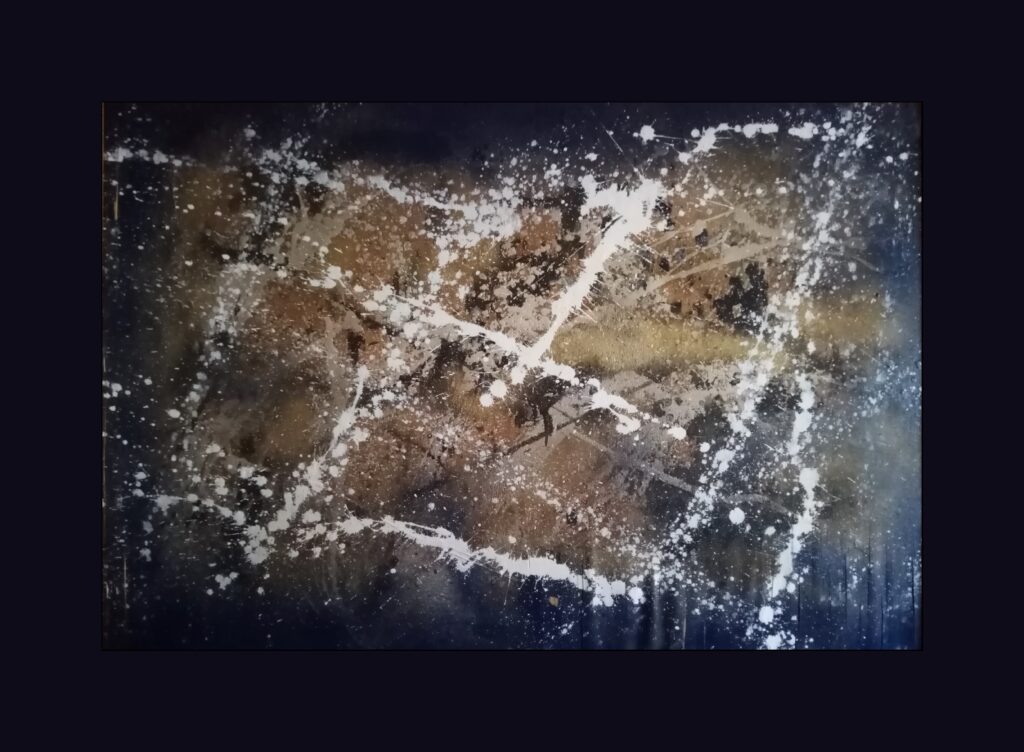 Nel cuore arido d’Oriente, dove l’uomo non potrebbe sopravvivere, affiora una preziosità segreta dalle crepe della terra. Polvere d’oro si solleva, brillando sotto il sole cocente, un mormorio di ricchezza nascosta. Il vento sussurra tra le fessure, portando con sé il caldo del giorno e il freddo della notte, un ballo di contrasti nella vastità. Crepe continue tracciano il percorso, profondi solchi che narrano di sofferenza e di forza, di una terra che vive nonostante la sete, nonostante il tempo. In questo quadro astratto, ogni crepa, ogni granello d’oro, racconta una storia di bellezza nascosta, di una natura che risplende anche nel deserto a noi proibito.