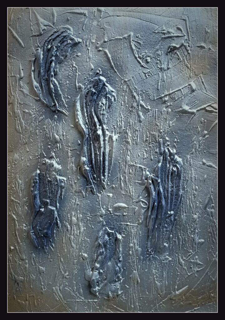 Dall’ Androgino che denuncia il rifiuto culturale della diversità, alle Anime Penitenti e alle Beatitudini Celesti ispirate a Dante, dall’ Entropia che racconta il del cosmo alla drammaticità di Passio , fino ai segni ribelli di Omaggio a Pollock e alle opere più recenti sulla Siccità e le Preziosità Segrete : tutto si compone come un mosaico di tensione tra terra e cielo, materia e spirito, oscurità e luce.